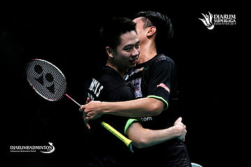 Kevin Sanjaya/Mohammad Ahsan (PB Djarum) berpelukan.
