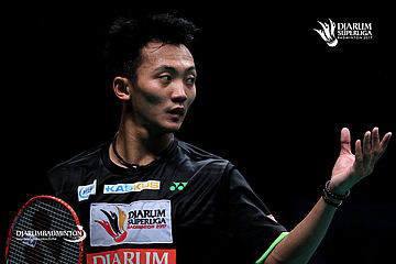 Ihsan Maulana Mustofa (PB Djarum) meminta pergantian shuttlecock.