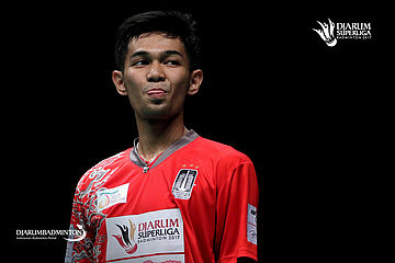 Ihsan Maulana Mustofa (PB Djarum) mengembalikan shuttlecock.