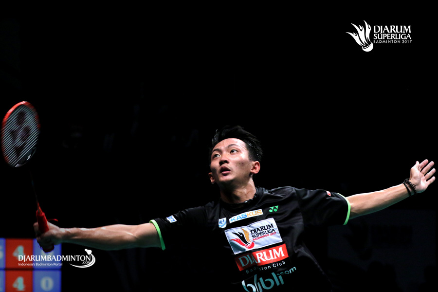 Jonatan Christie (PB Musica Champion) menghadang serangan.