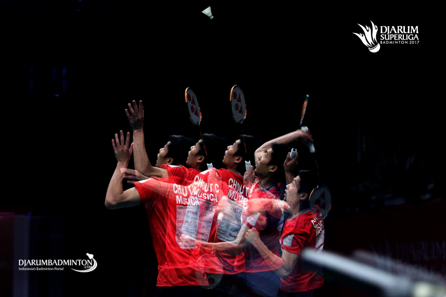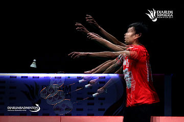 Chou Tien Chen (PB Musica Champion) menghadang serangan.
