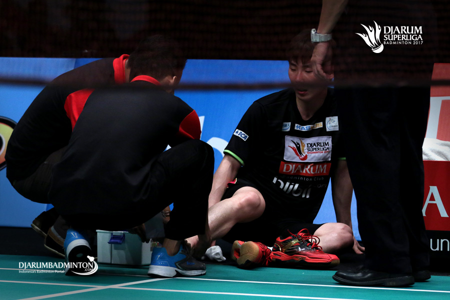 Son Wan Ho (PB Djarum) saat mendapatkan perawatan tim medis.