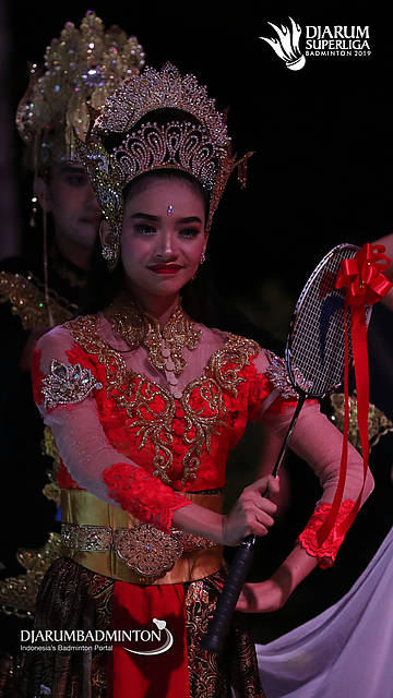 Seorang penari memeriahkan Gala Dinner Djarum Superliga Badminton 2019.