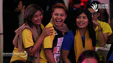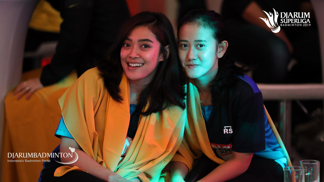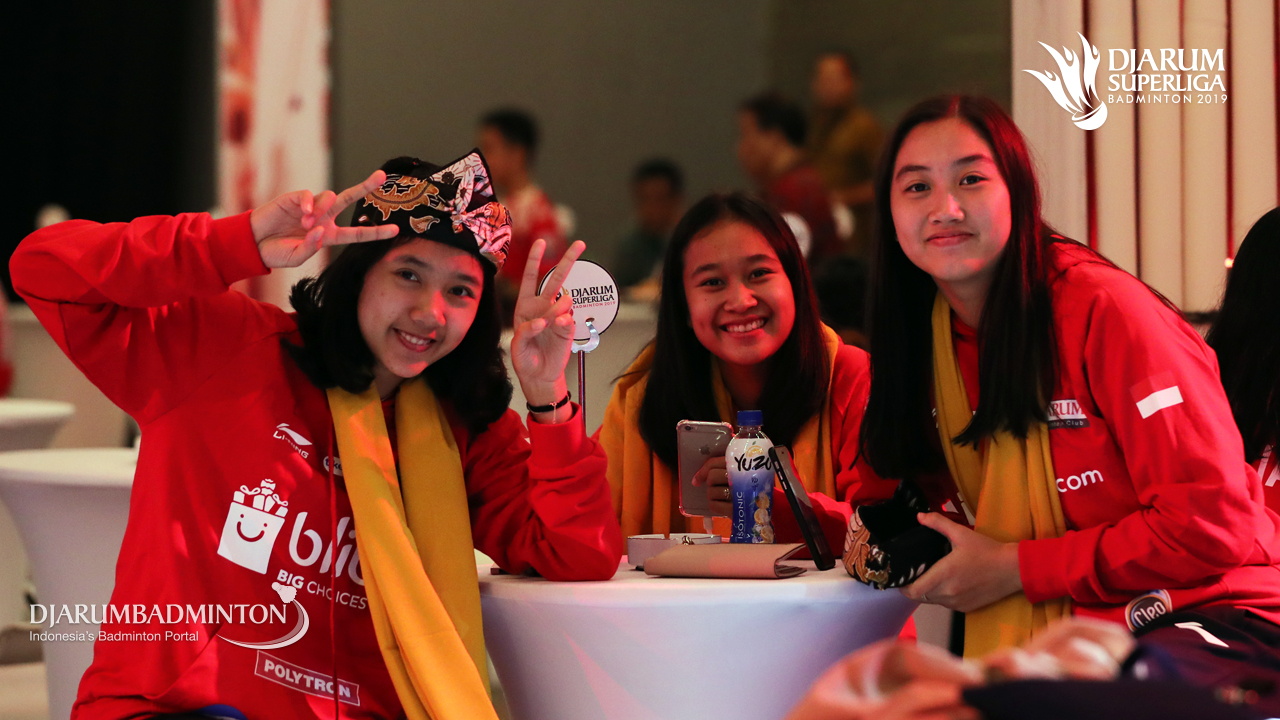 Jauza Fadhila Sugiarto, Apriyani Rahayu, Yulfira Barkah terhibur saat menikmati gala dinner Djarum Superliga Badminton 2019.