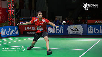 Aisyah Sativa FATETANI (TIKET.COM CHAMPION KLATEN) bersiap menyambut shuttlecock