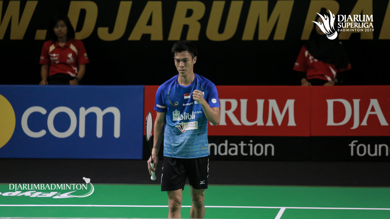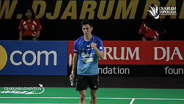 Ekpsresi Shesar Hiren RHUSTAVITO (DJARUM KUDUS) saat Jonatan CHRISTIE (MUSICA TRINITY) gagal mengembalikan shuttlecock