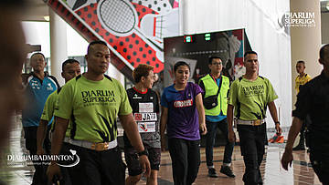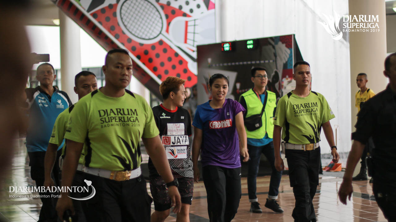 Apriyani Rahayu (JAYA RAYA) dan Gregoria Mariska Tunjung (MUTIARA CARDINAL) saat berjalan menuju lokasi meet and greet