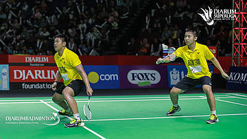 Berry Anggriawan/Mohammad Ahsan (Djarum Kudus) Menahan serangan
