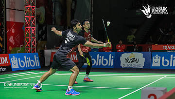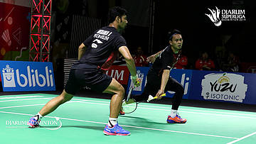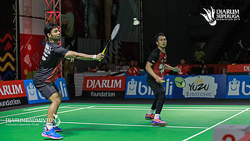 Berry ANGRIAWAN+Mohammad AHSAN (DJARUM KUDUS) mengembalikan shuttlecock
