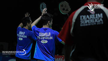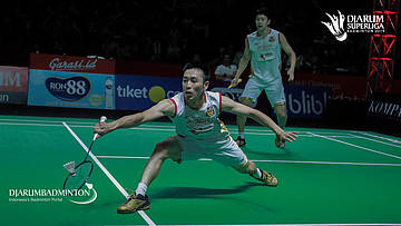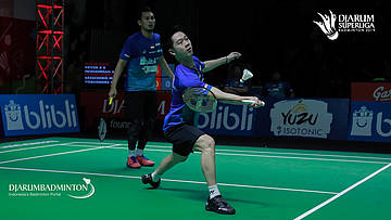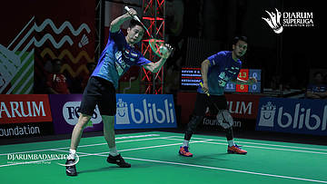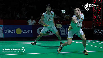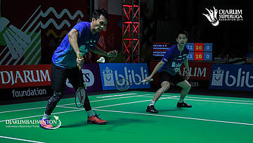 Kevin Sanjaya Sukamuljo/Mohammad Ahsan (Djarum Kudus) Menahan serangan