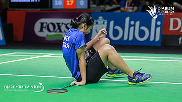 Gregoria Mariska TUNJUNG (MUTIARA CARDINAL BANDUNG) terjatuh saat berusaha mengembalikan serangan
