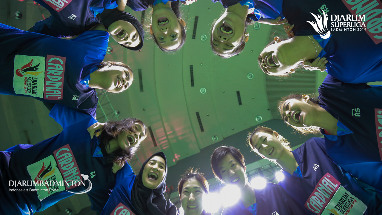 Team Putri MUTIARA CARDINAL BANDUNG meneriakan yel yel sebelum bertanding