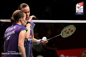 Christinna Pedersen/Kamilla Rytter Juhl saling berkomunikasi di lapangan