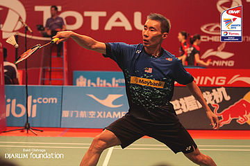 Lee Chong Wei (MAY) mengembalikan shuttlecock ke arah Kestuis Navickas (LTU)