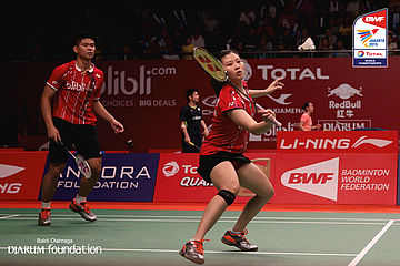 Praveen Jordan/Debby Susanto (INA) menyambut pengembalian shuttlecock