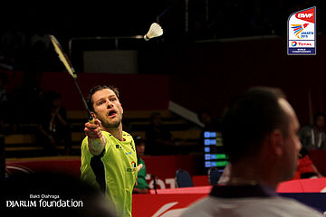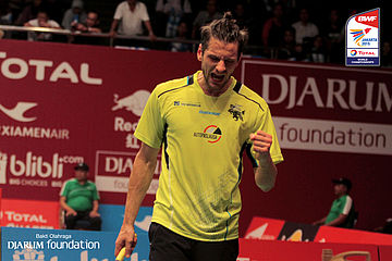 Ekspresi Kestuis Navickas (LTU) saat berhasil mencuri poin dari Lee Chong Wei (MAY)