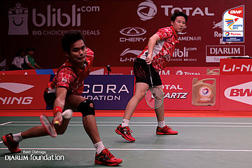 Riky Widianto/Richi Puspita D (INA) berusaha menggapai shuttlecock