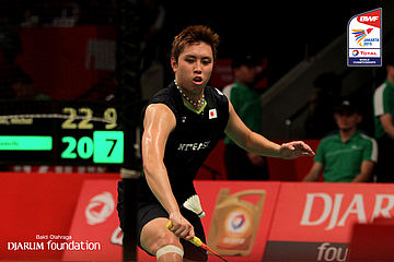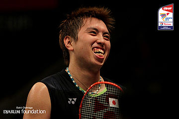 Kenichi Tago (JPN) menyambut pengembalian shuttlecock dari lawan