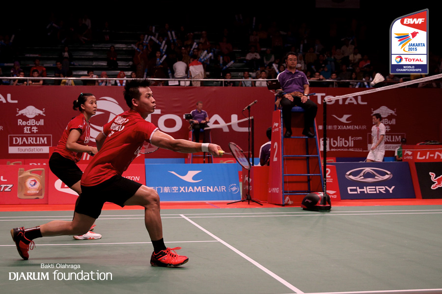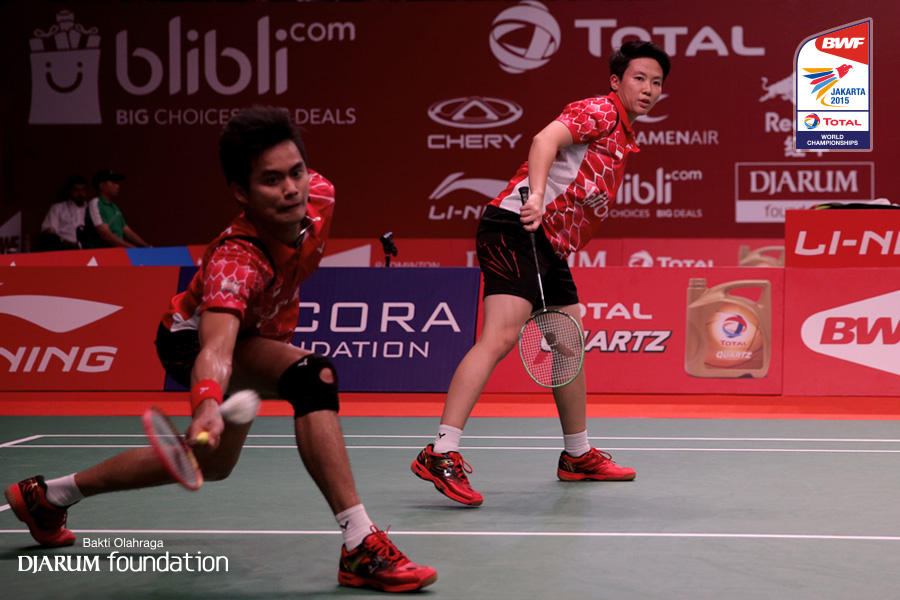 Tontowi Ahmad/Liliyana Natsir (INA) menahan serangan lawan
