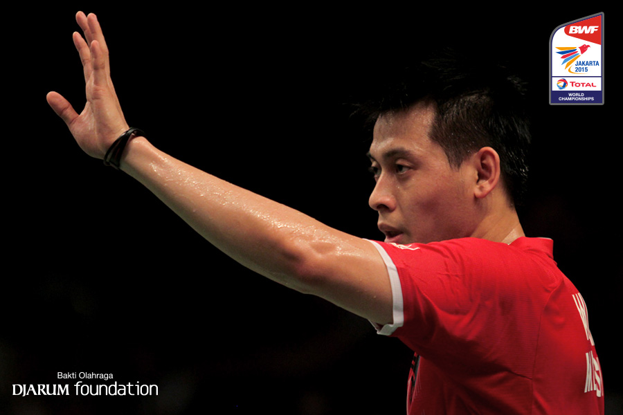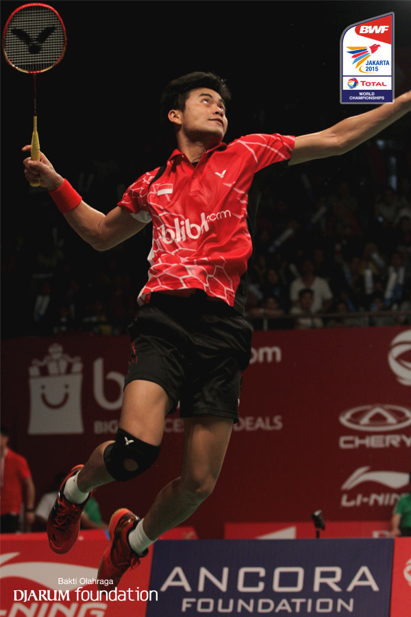 Tontowi Ahmad (INA) bersiap melepaskan smash