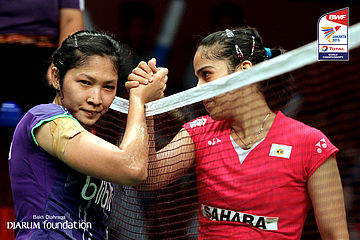 Lindaweni Fanetri (INA) dan Saina Nehwal (IND) bersalaman seusai bertanding