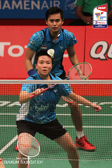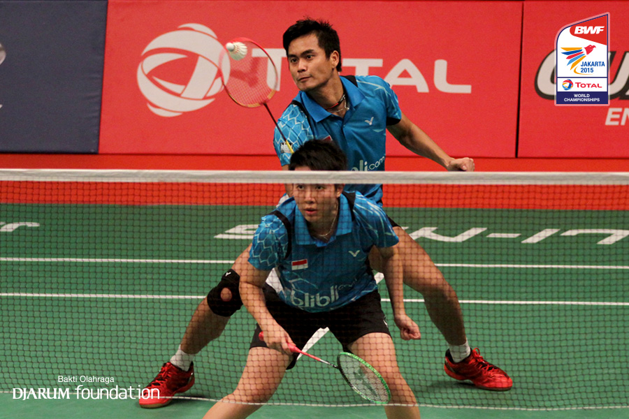 Tontowi Ahmad/Liliyana Natsir (INA) menahan serangan lawan