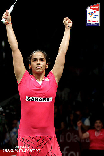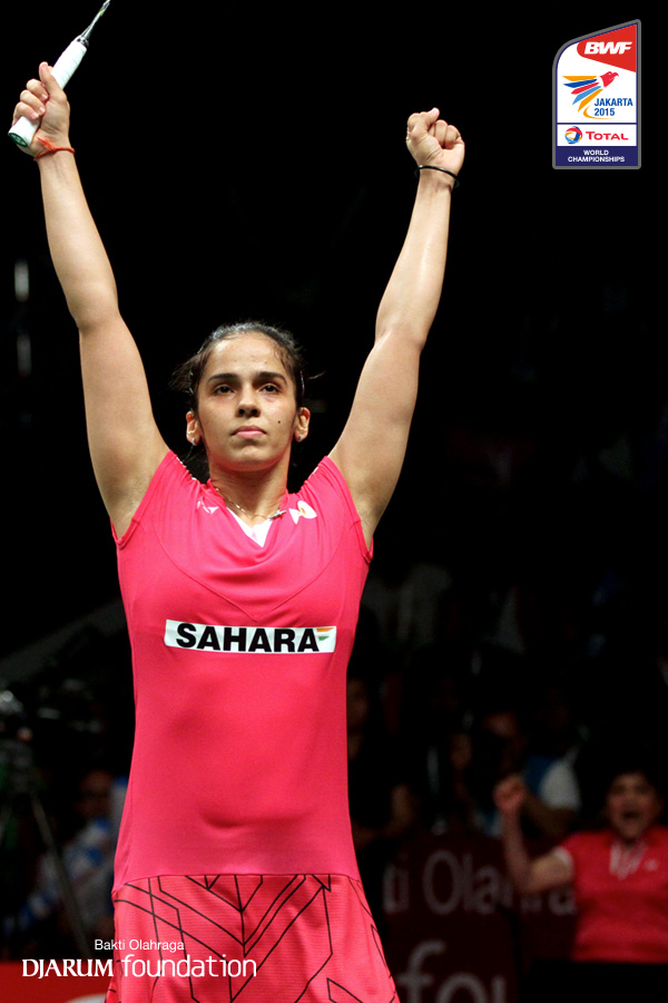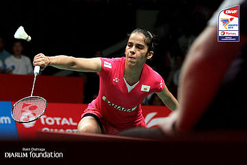 Saina Nehwal (IND) mengembalikan shuttlecock ke arah lawan