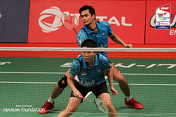Tontowi Ahmad/Liliyana Natsir (INA) mengembalikan shuttlecock ke arah lawan