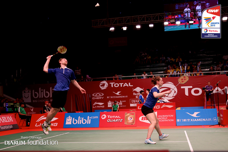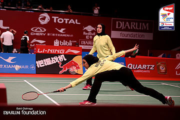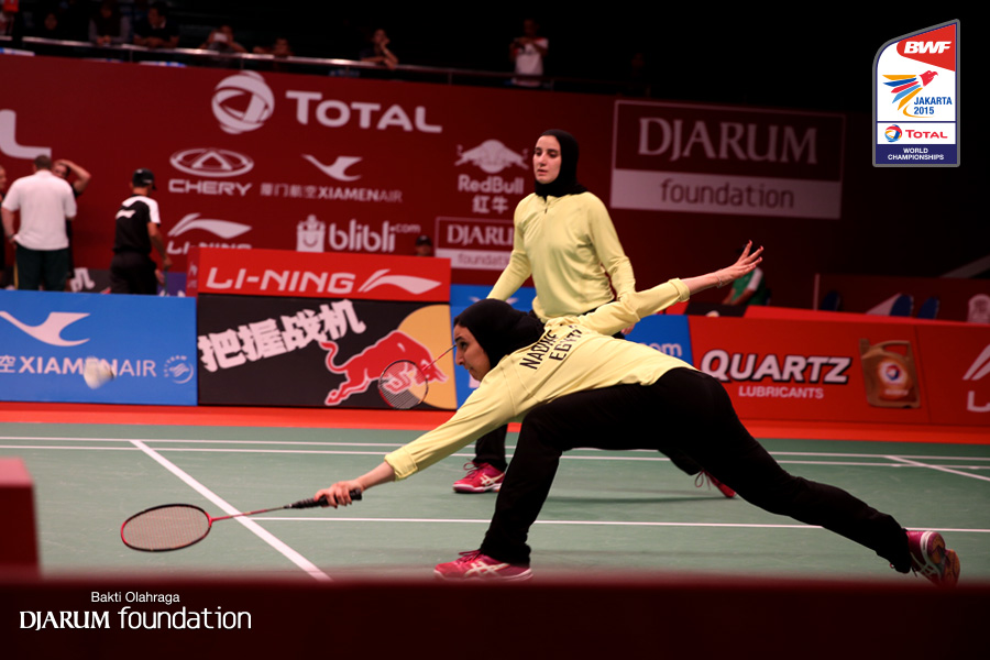 Nadine Ashraf/Menna Eltanany (EGY) mengembalikan shuttlecock ke arah Heather Olver/Lauren Smith (ENG)