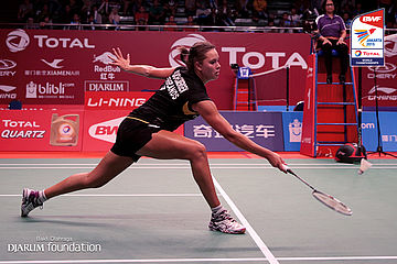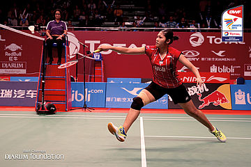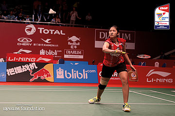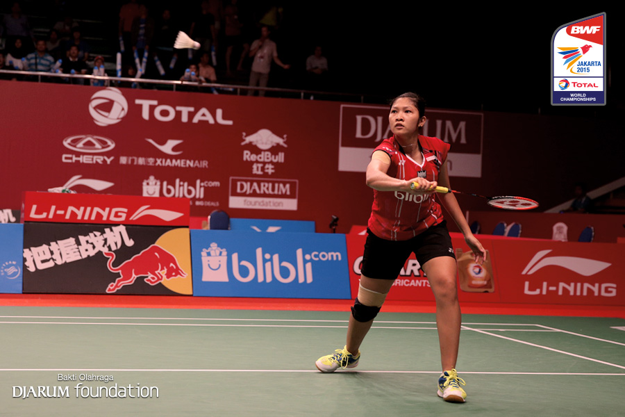 Lindaweni Fanetri (INA) bersiap mengembalikan shuttlecock ke arah Soraya De Vish Eijbergen (NED)