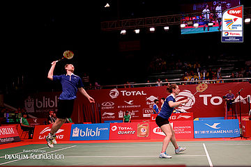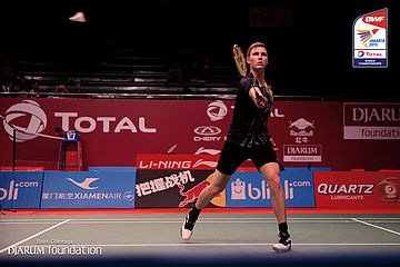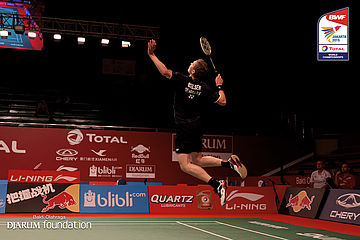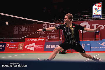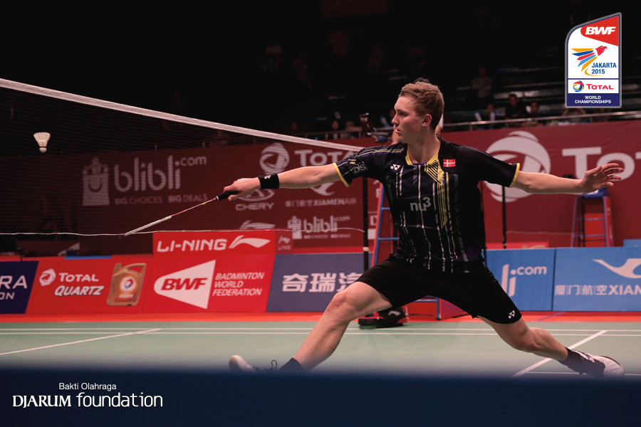 Viktor Axelsen (DEN) bersiap melepaskan jumping smash