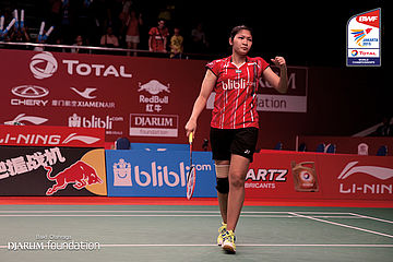 Ekspresi Lindaweni Fanetri (INA) saat berhasil mencetak poin