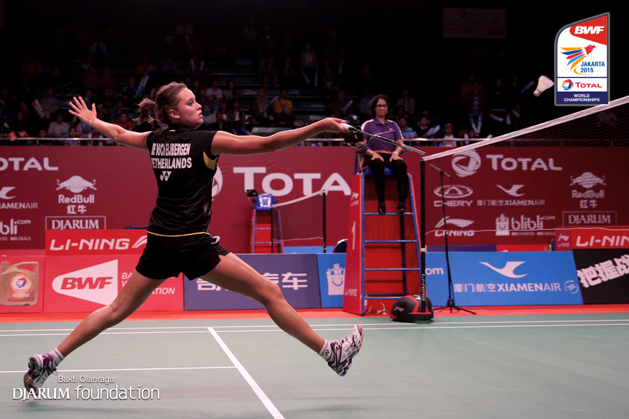 Soraya De Vish Eijbergen (NED) bersiap menyambut pengembalian dari Lindaweni Fanetri (INA)